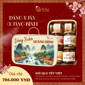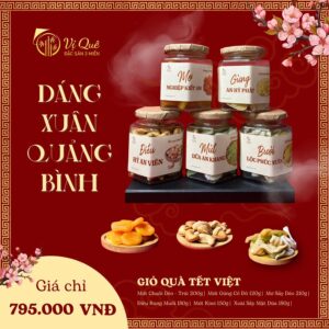 “Giỏ Quà Tết Cổ Truyền 2024-DÁNG XUÂN QUẢNG BÌNHGiỏ quà Tết độc đáo với các sản phẩm truyền thống chất lượng cao, từ mứt chuối đẹo, mứt gừng thơm lừng, đến mơ sấy ngon mê ly. Thiết kế sang trọng, đi kèm giỏ tre làm thủ công. Tặng quà để chia sẻ niềm vui và hạnh phúc trong dịp Tết.Mứt Chuối Dẻo – Trái 200g: Mứt chuối tươi ngon, giòn ngọt, làm từ trái chuối chín tự nhiên.