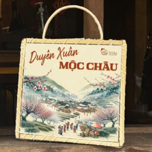 Giỏ quà được bọc trong chiếc giỏ tre thủ công tinh xảo từ làng nghề Hà Nội, điểm xuyết bằng sắc đỏ, vàng và xanh lá – biểu tượng của tài lộc, phú quý và sức sống. Hoa văn truyền thống kết hợp hình ảnh Mộc Châu được lựa chọn kỹ lưỡng để tôn vinh vẻ đẹp và tinh hoa vùng đất này.